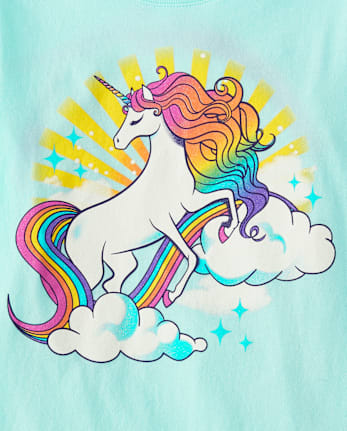 MULTIPACK — 3-pack of graphic tees: 1 rainbow unicorn design; 1 'Aloha' with beach design; 1 dolphin with palm trees and flowers design